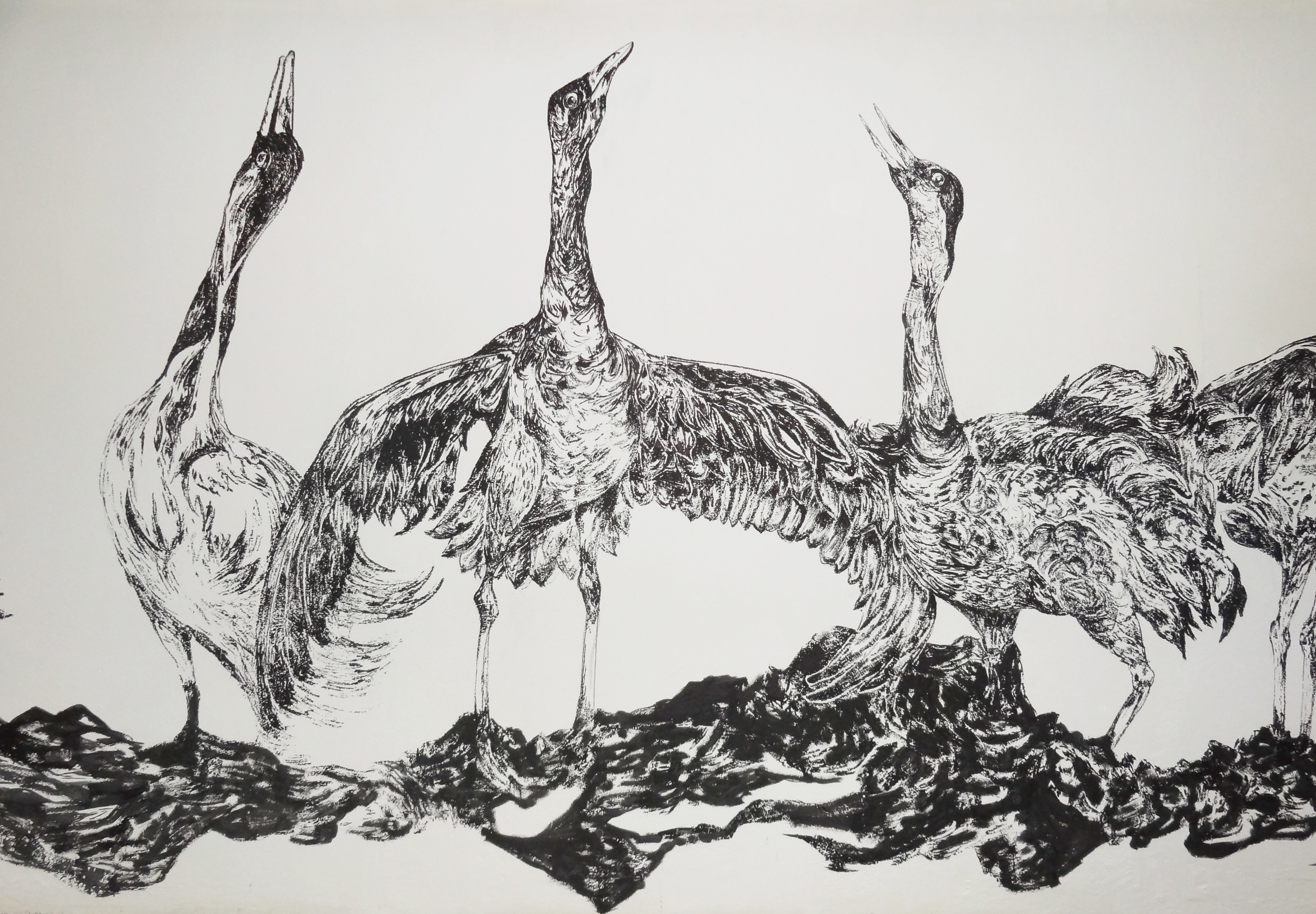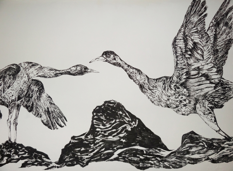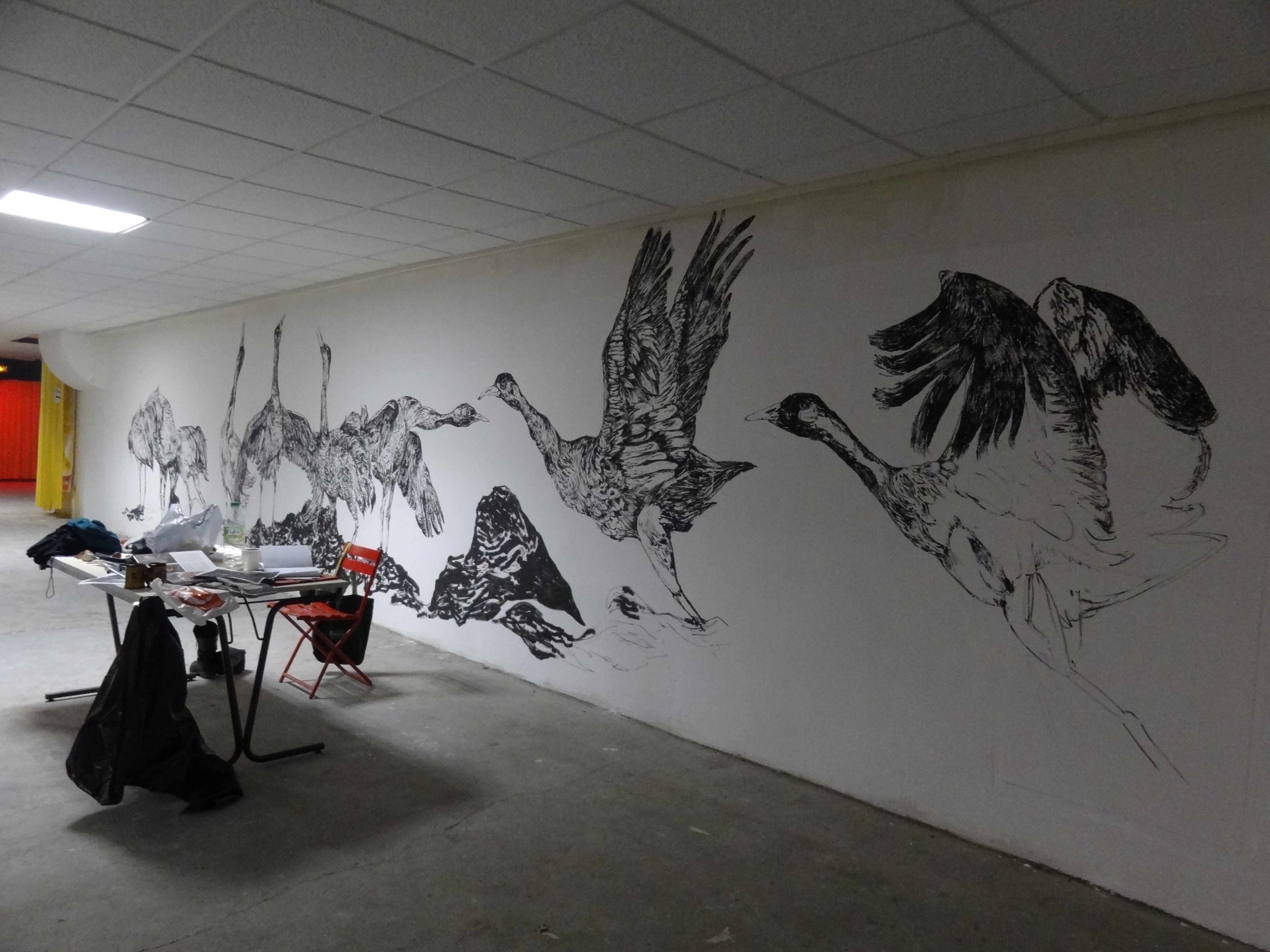 Cranes, fresco realized during the residency « Mauvaises Graines » organized by the Petit Lieu de l’Art Contemporain at the cultural center La Tomate (la Valette-du-Var). Mixed media, 10 x 2,5 m approximately.
