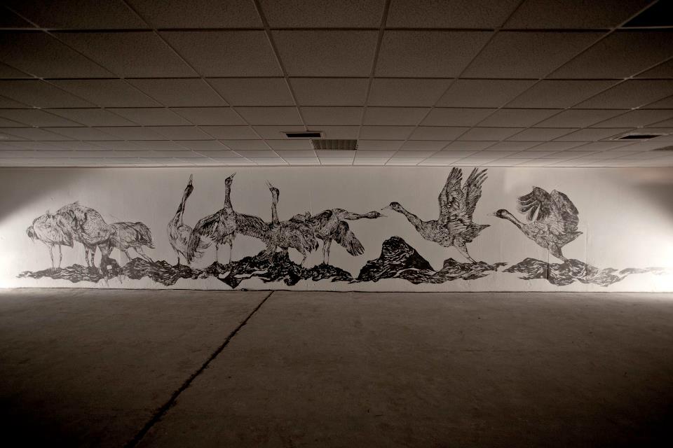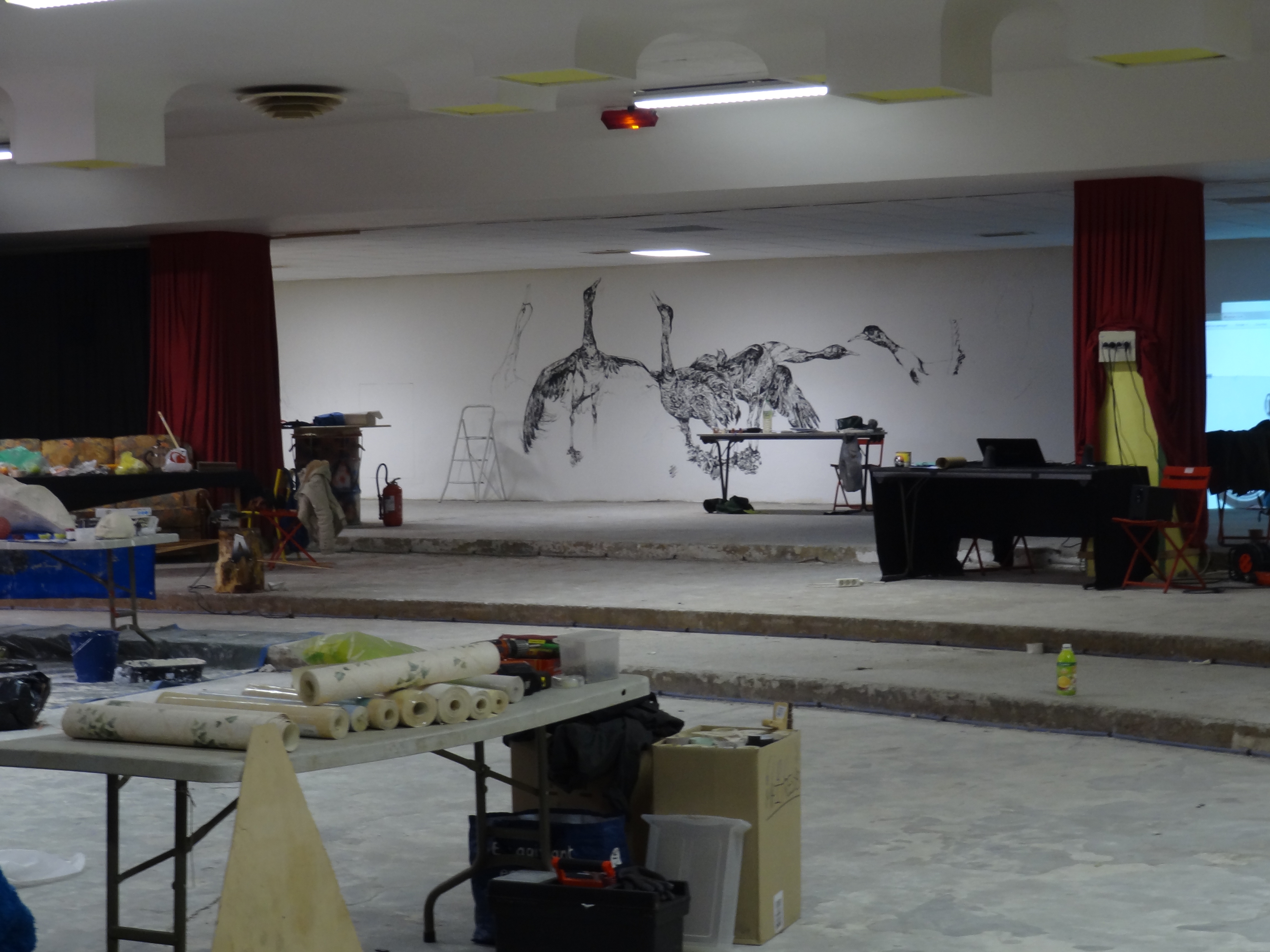 « Grues », realized during the residency « Mauvaises Graines » organized by the Petit Lieu de l’Art Contemporain at the cultural center La Tomate (la Valette-du-Var). Mixed media, 10 x 2,5 m approximately.
